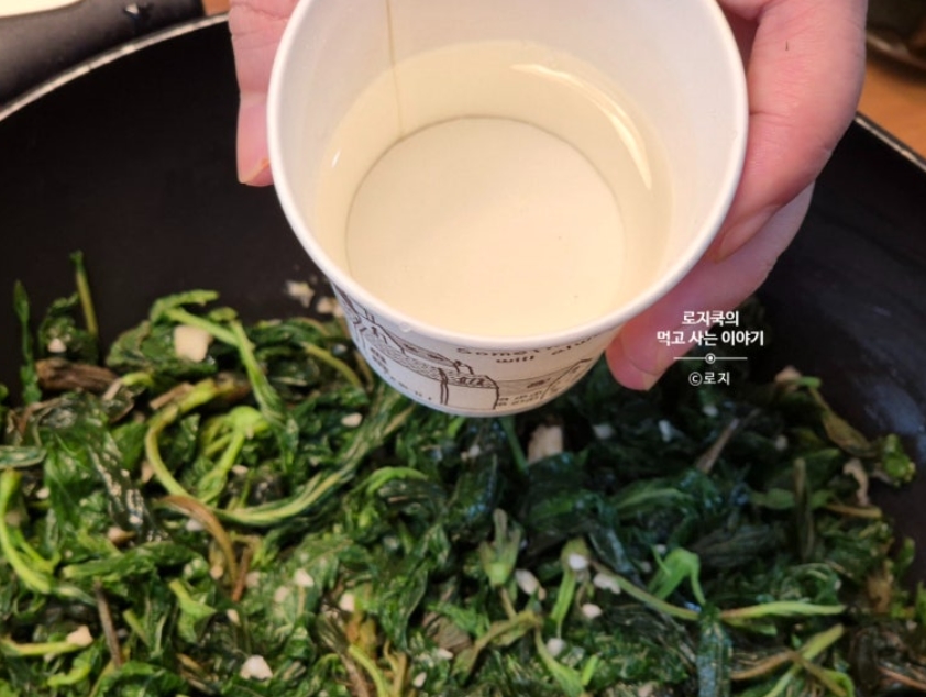 5. 팬에 깻잎순을 넣고, 국간장, 간 마늘을 넣어줍니다.