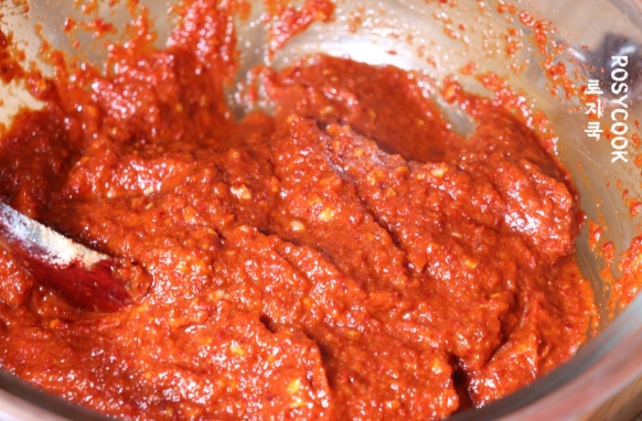 간 재료에 간마늘, 설탕, 고춧가루, 매실청, 소금, 식초, 참기름을 순서대로 넣고 잘 섞어주세요.