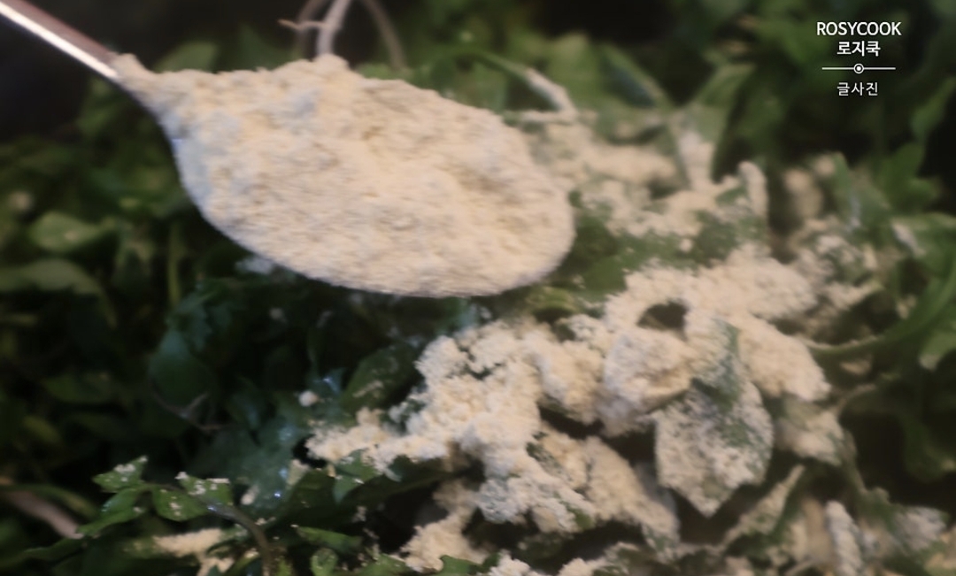 9. 손질해둔 냉이에 날콩가루 6 큰 술을 넣고 조물조물 무칩니다.