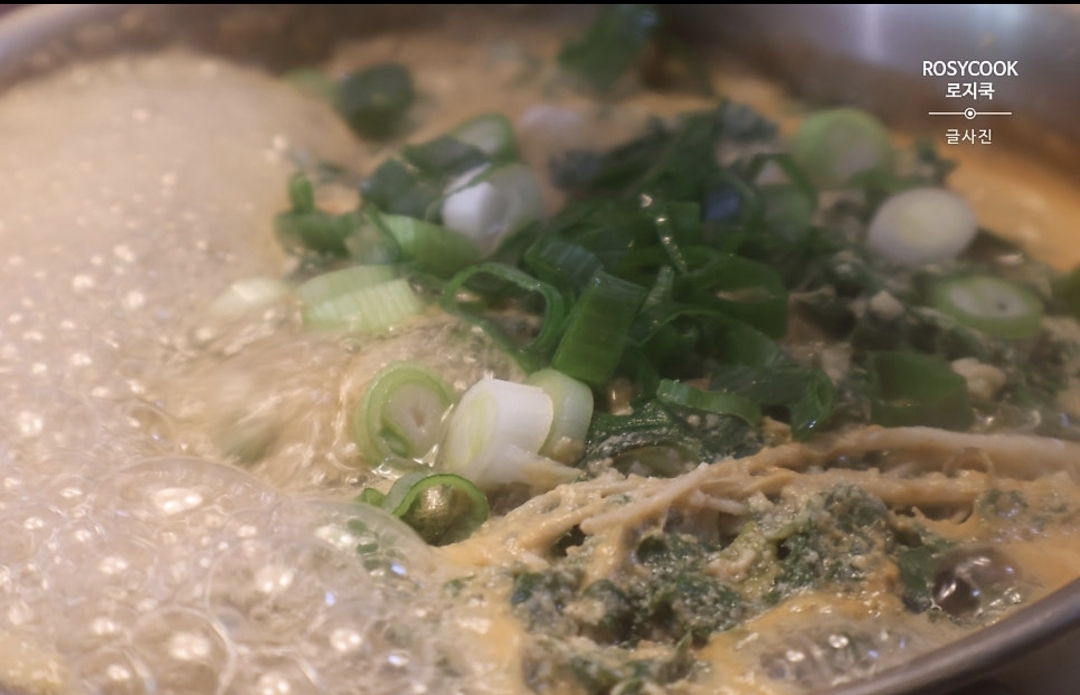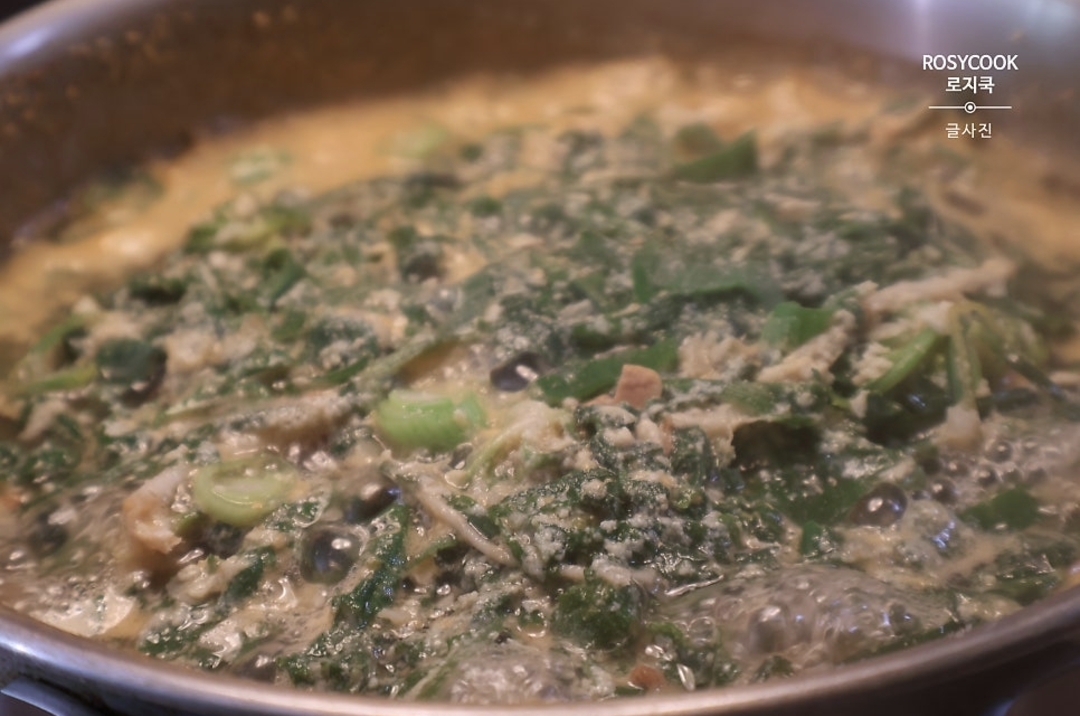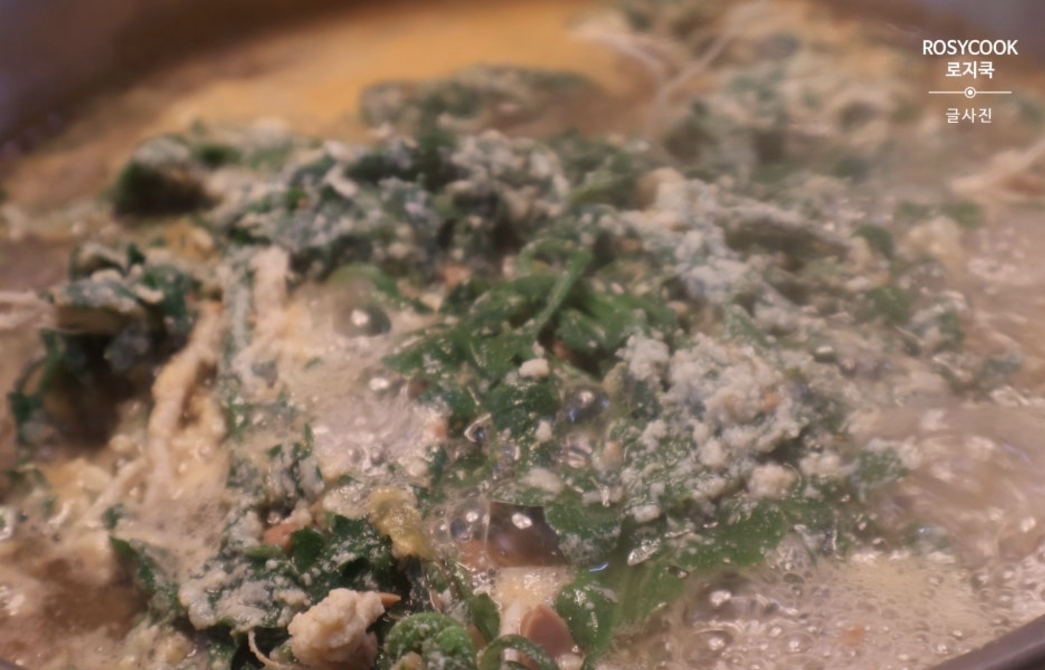 10. 냉이를 넣고 날콩가루가 풀어지지 않도록 그대로 끓여줍니다.