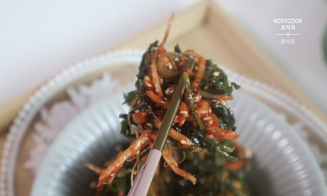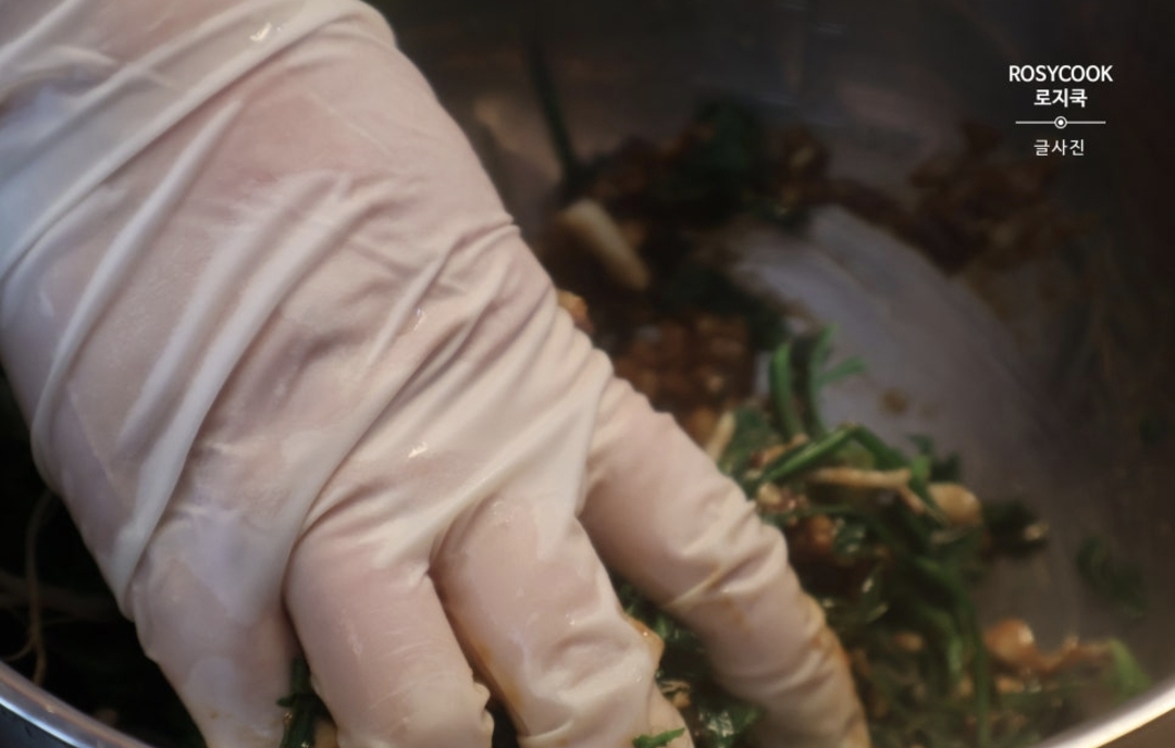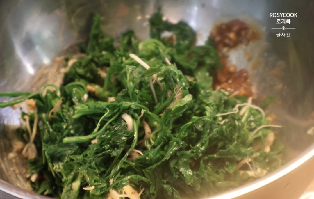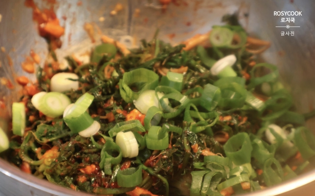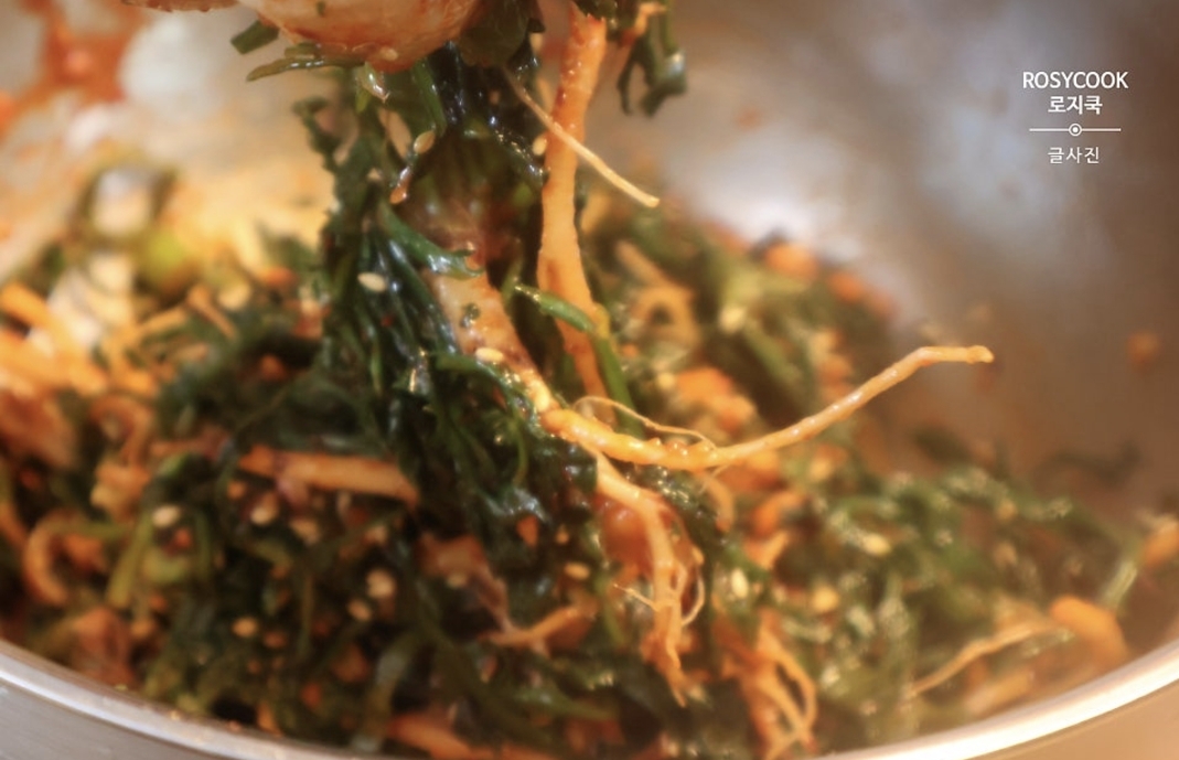 8. 양념을 잘 섞어준 후, 준비해둔 냉이를 넣어줍니다.