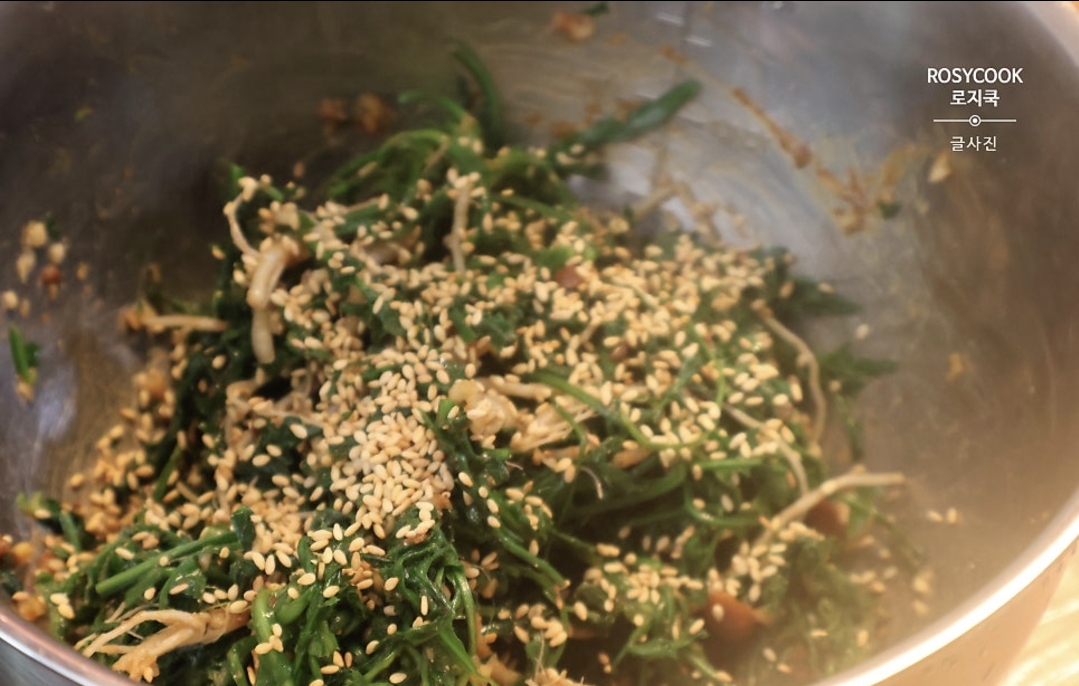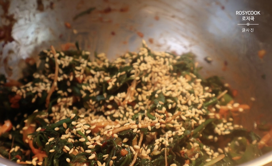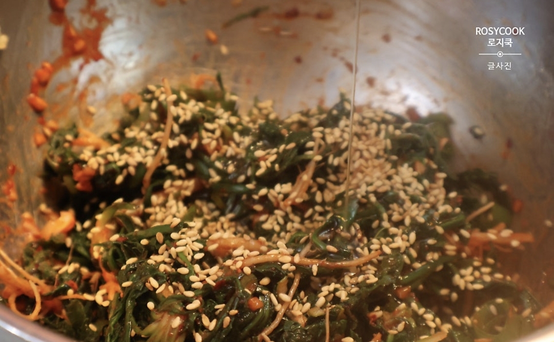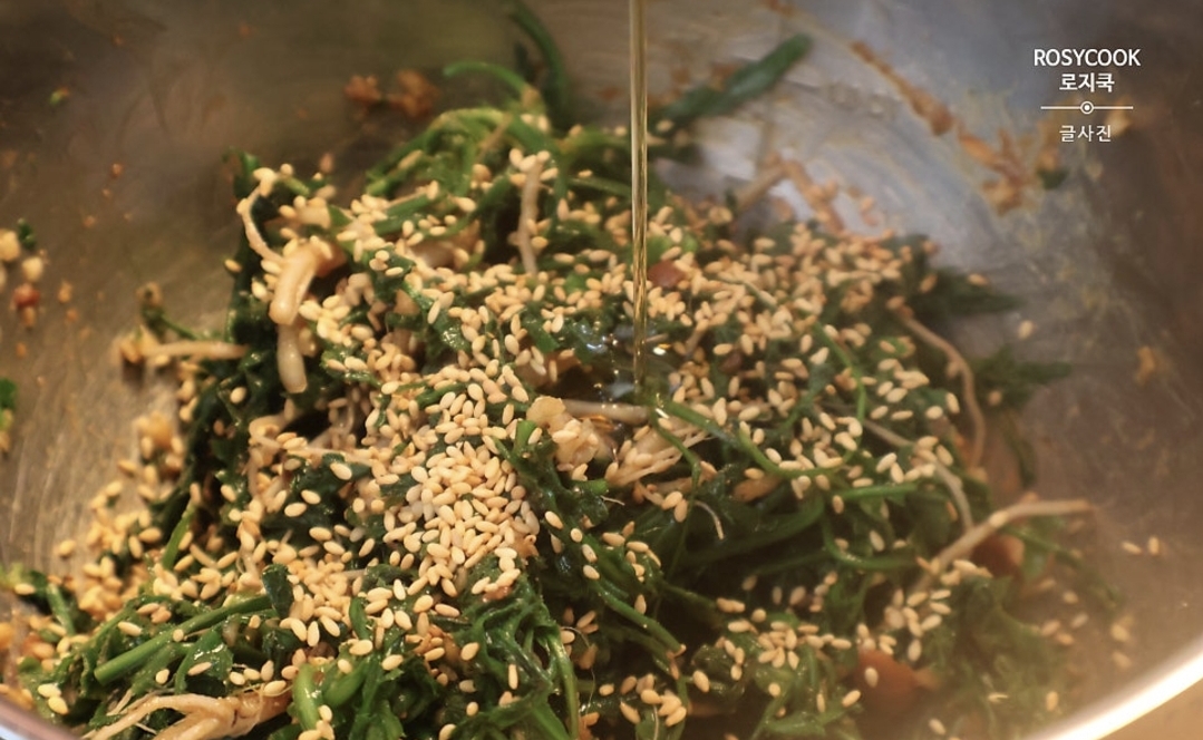 10. 깨를 전체적으로 뿌려주시고 참기름을 둘러준 후 다시 한번 더 조물조물 무쳐 마무리합니다.