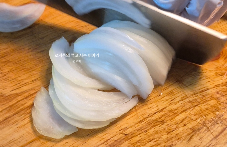 양파는 채 썰고, 쪽파는 송송 썰어 한 줌 준비합니다. 양파는 노각과 어울려 시원한 풍미를 더해줘요.