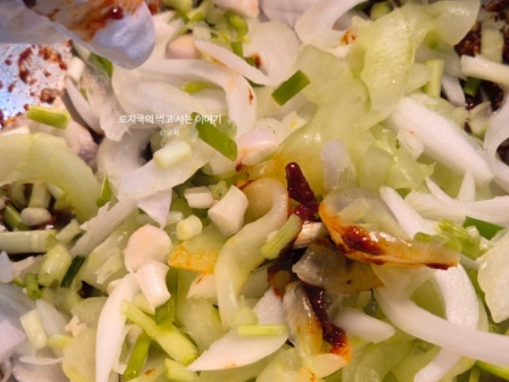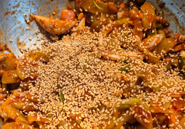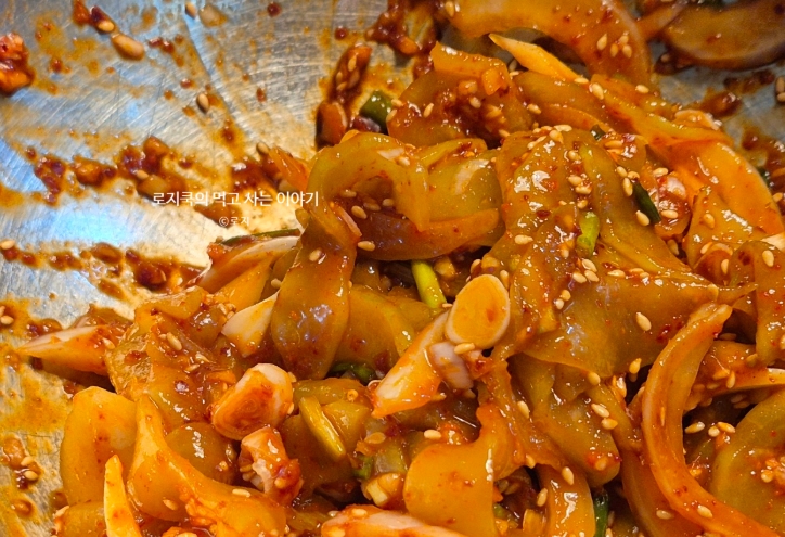 양념에 노각을 넣고 살살 무쳐준 뒤, 양파·쪽파를 넣고 식초를 더해줍니다. 마지막으로 참기름과 통깨를 뿌려 마무리하면 완성!