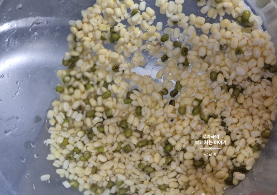 1. 녹두 1컵을 8시간 이상 불려둡니다. 전날에 미리 불려두시는 게 좋습니다. 찹쌀 1컵도 불려두세요. 불린 녹두를 흐르는 물에서 비벼 세척해 주시면 껍질을 쉽게 벗기실 수 있습니다. 잘 불린 녹두라면 껍질이 잘 벗겨질 겁니다. 그럼에도 잘 벗겨지지 않는 녹두가 있다면 그냥 두셔도 됩니다. 최대한 껍질을 제거해 줍니다.