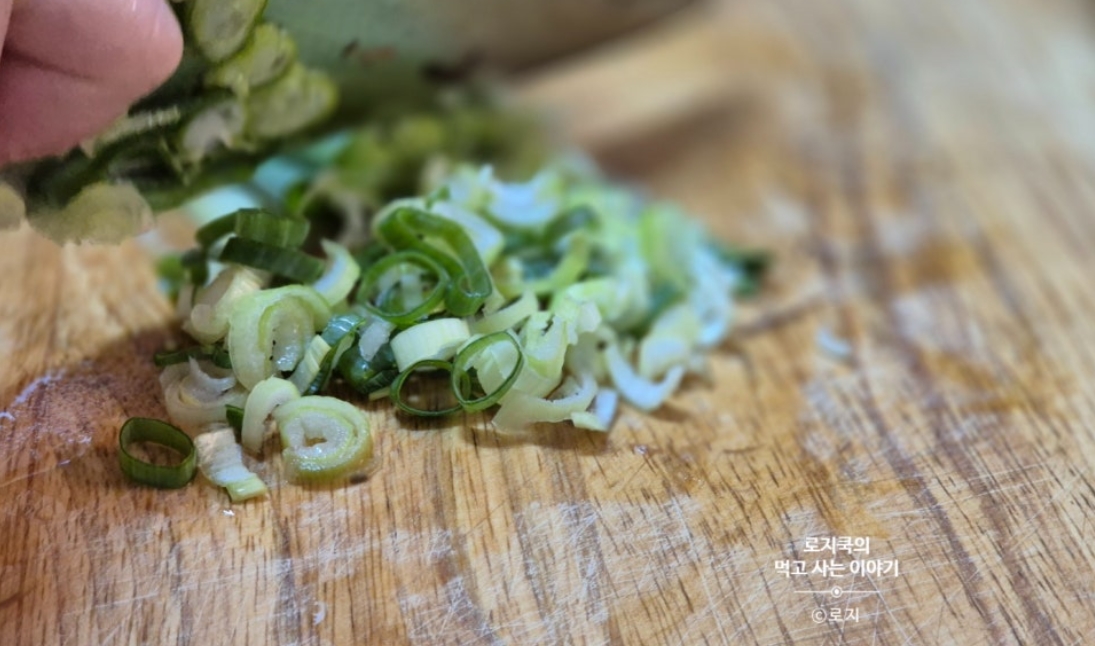 3. 삶은 고사리 1줌 정도를 사용했습니다. 물기를 꽉 짠 후, 먹기 좋은 크기로 썰어주시면 됩니다. 대파 1대를 송송 썰어줍니다. 제사에 파를 넣지 않는 집이라면 생략하셔도 괜찮습니다. 돼지고기가 들어가니 저는 넣었습니다.