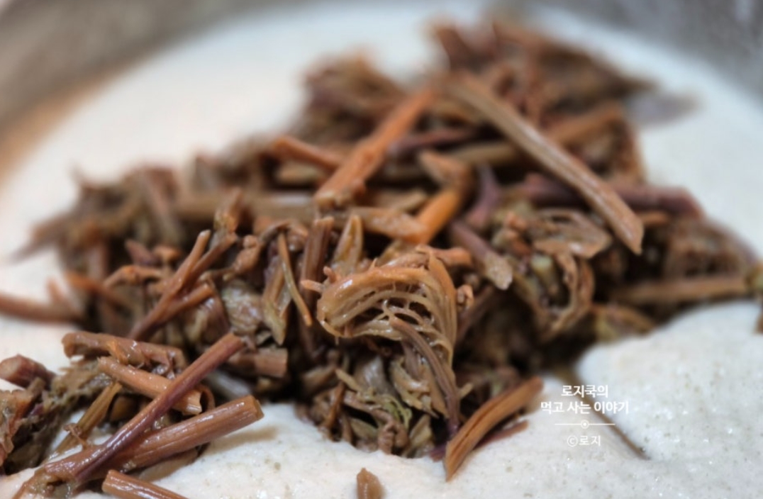 4. 볼에 갈아둔 찹쌀과 녹두를 붓고, 고사리를 넣어주고 김치와 대파도 넣어줍니다.