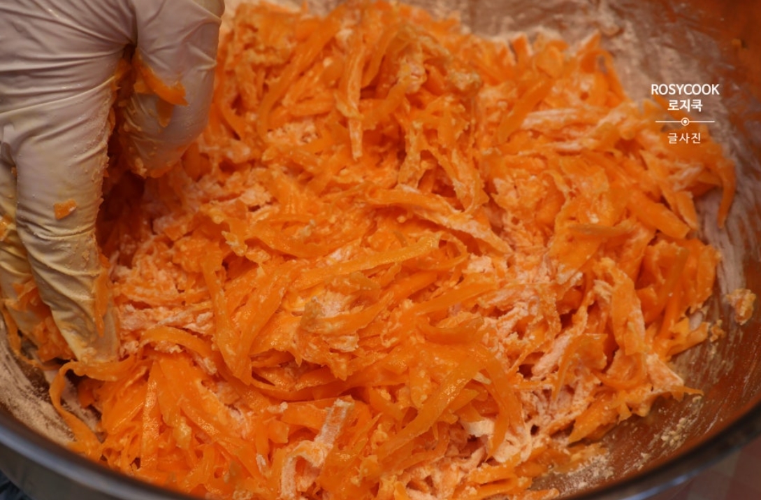 7. 부침가루 6 큰 술을 넣어줍니다. 조물조물 무쳐가며 잘 버무려줍니다.