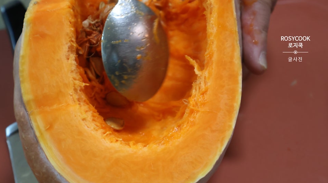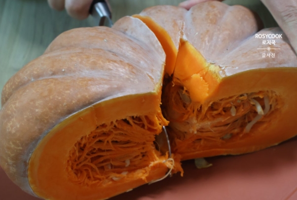 2. 호박을 껍질을 까기 좋게 잘라주셔야 합니다. 단단하기 때문에 칼을 넣을 때는 움푹 팬 골을 따라서 넣어줍니다.