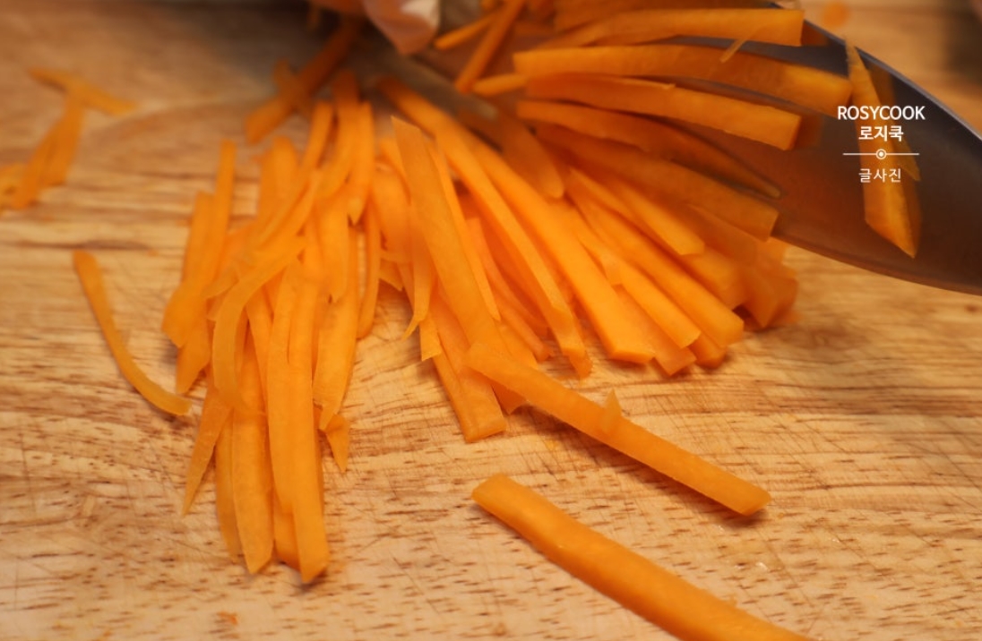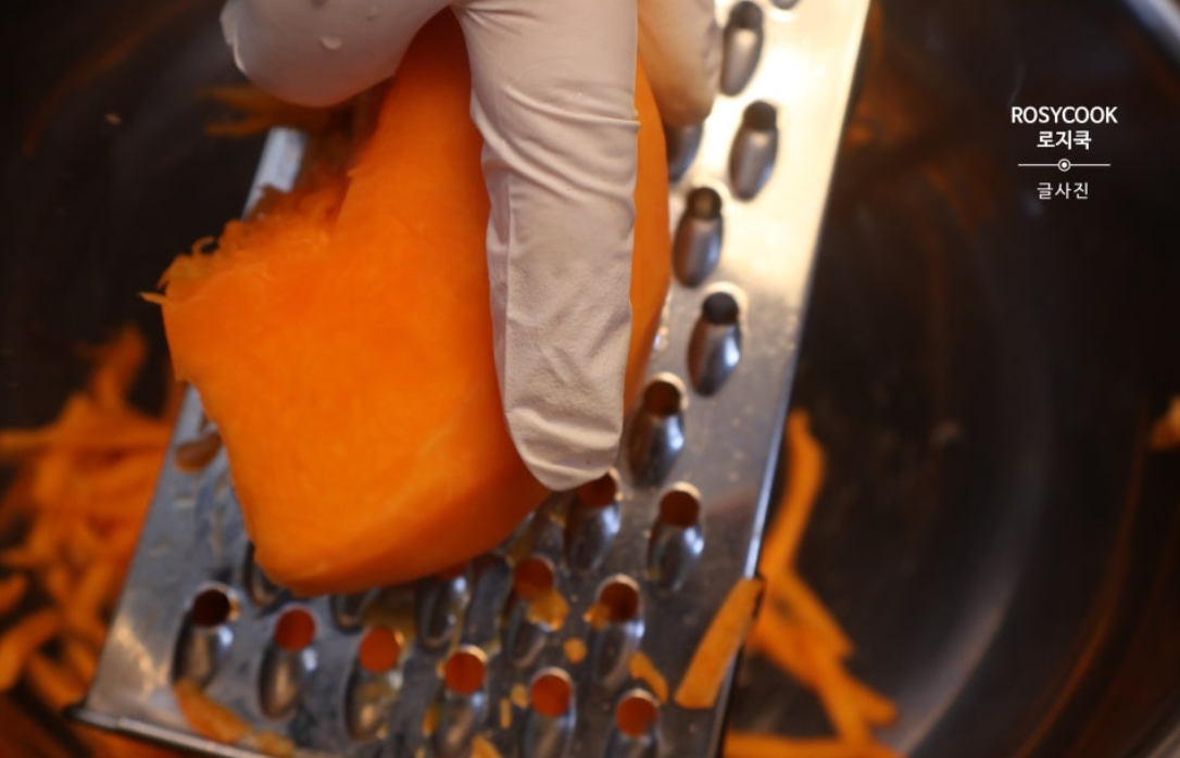 5. 채칼을 사용해서 채를 썰어주셔도 좋습니다. 무처럼 밀면서 채 썰어주시면 됩니다. 물론 칼로 썰어주셔도 되고요. 손질한 늙은 호박 702g을 채 썰어줬어요.