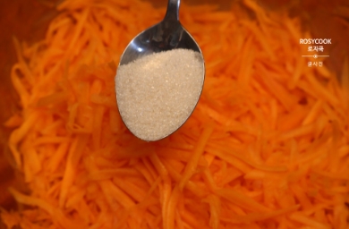 6. 채 썬 늙은호박에 설탕 1/2 큰 술과 소금 1/4 큰 술을 넣고 10분 정도 절여줬습니다. 수분을 꽉 짜서 준비해 줍니다.