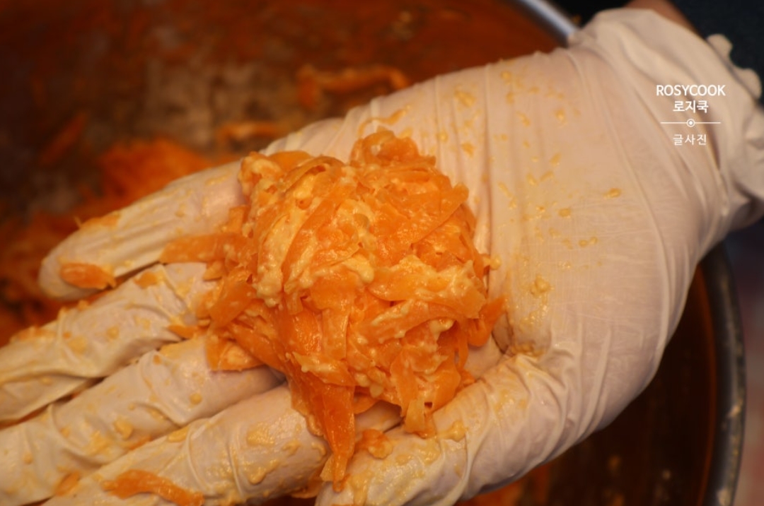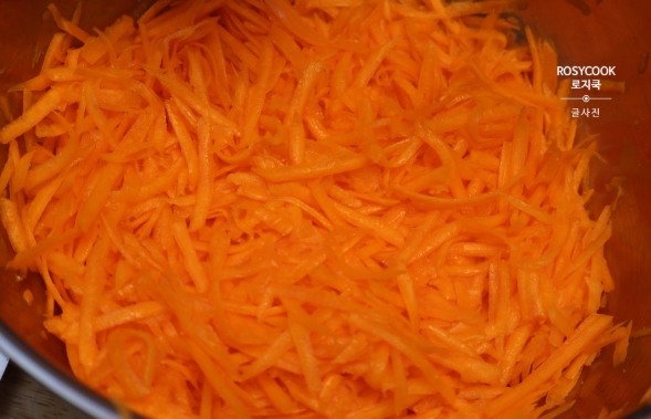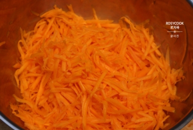 6. 채 썬 늙은호박에 설탕 1/2 큰 술과 소금 1/4 큰 술을 넣고 10분 정도 절여줬습니다. 수분을 꽉 짜서 준비해 줍니다.