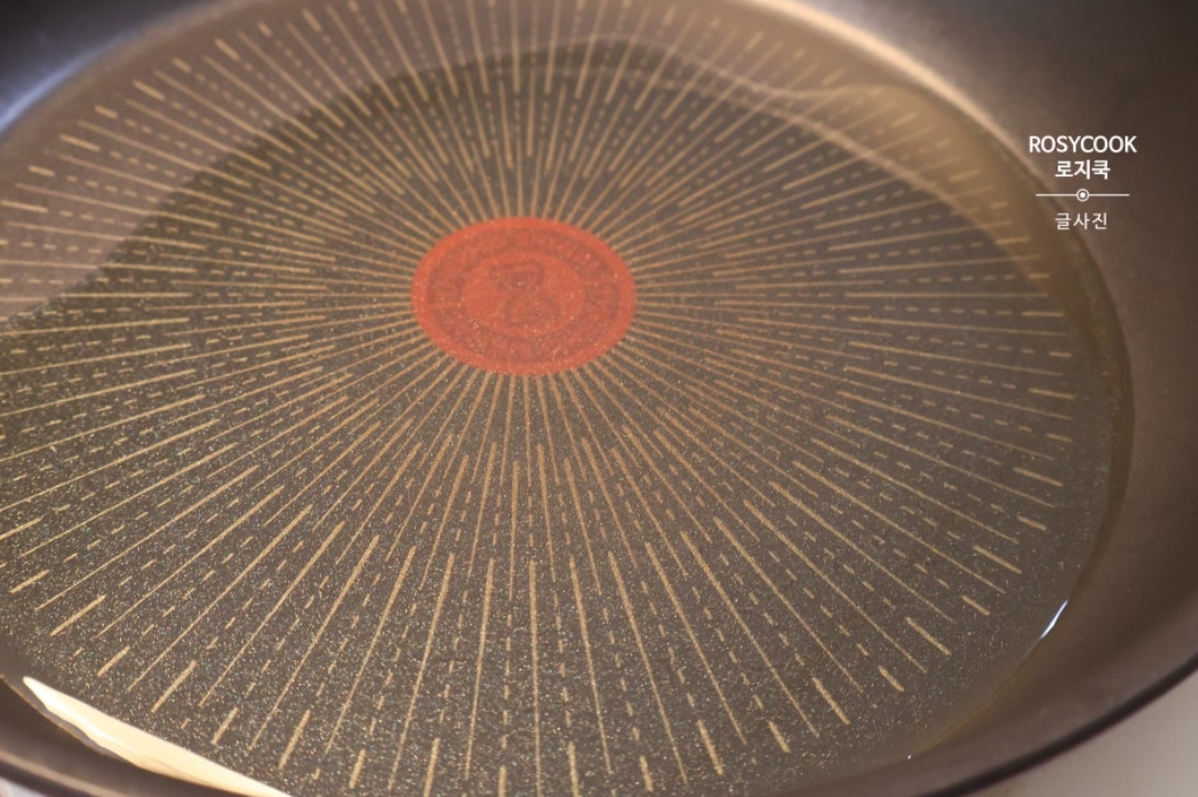 9. 식용유를 팬에 전체적으로 둘러주시고 예열해 줍니다. 늙은호박을 올려줍니다.
