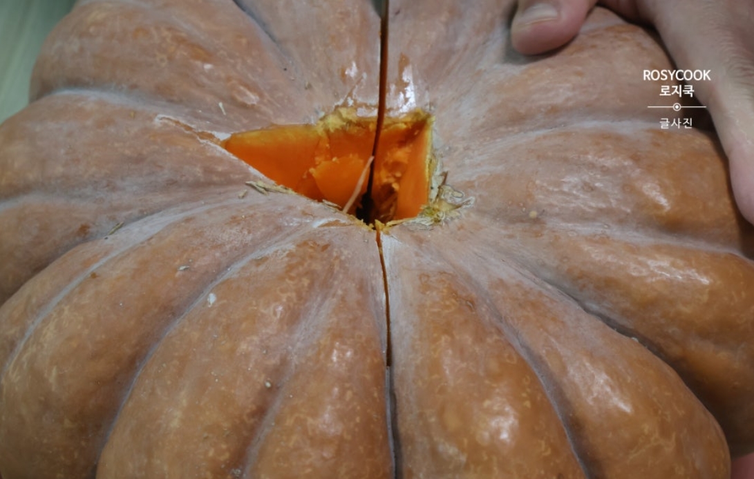 2. 호박을 껍질을 까기 좋게 잘라주셔야 합니다. 단단하기 때문에 칼을 넣을 때는 움푹 팬 골을 따라서 넣어줍니다.