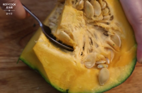 2. 숟가락으로 씨를 파서 제거해 줍니다. 꼭지 부분도 제거해 줍니다. 너무 딱딱해서 힘드시다면 전자레인지에 넣고 살짝 익힌 후, 잘려주셔도 됩니다.