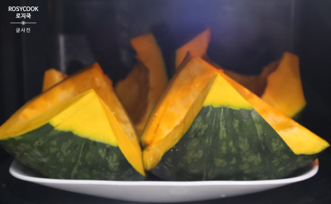 3. 전자레인지에 단호박을 돌려줍니다. 빨리 익게 하기 위해 좀 더 잘게 썰어주셔도 됩니다. 저는 좀 큰 사이즈의 단호박을 사용해서 30분 정도 돌려줬습니다.