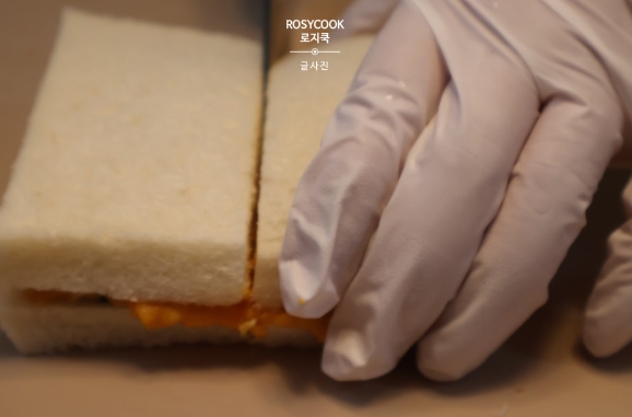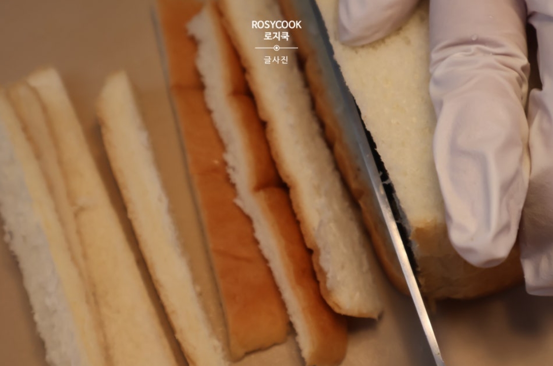 12. 먼저 깔끔하게 식빵의 테두리를 썰어서 제거해 줍니다.