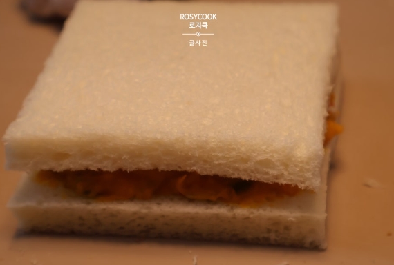 14. 식빵을 덮은 후, 반으로 잘라주시면 끝입니다.
