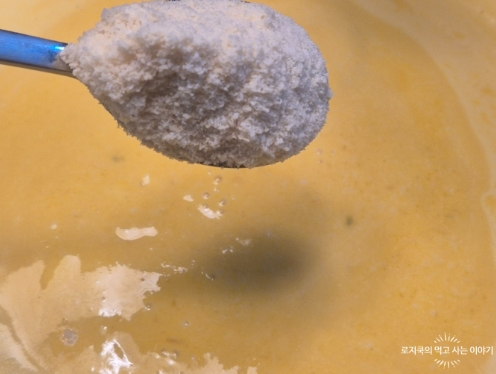 아몬드 가루 3 큰 술을 넣고 한 번 더 고루 섞어요. 농도가 더 필요하다면 아몬드 가루를 추가해도 좋아요.