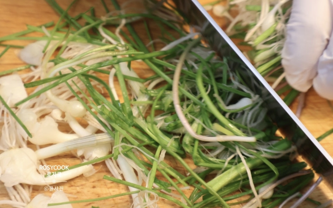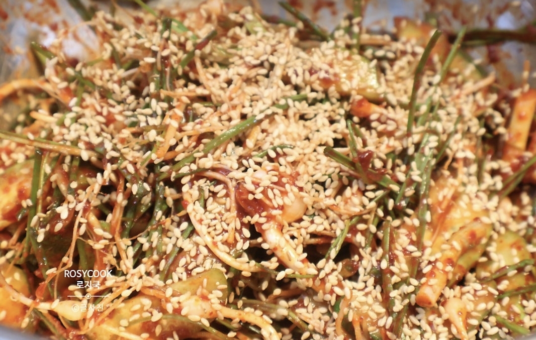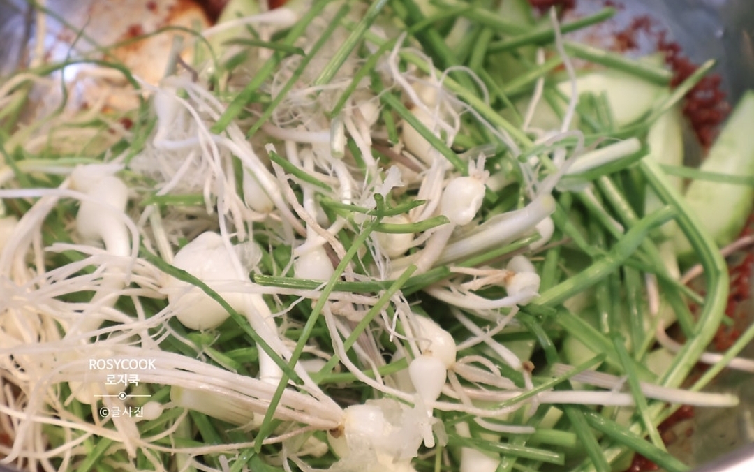 9. 오이를 넣고 손질해둔 달래를 넣어줍니다.