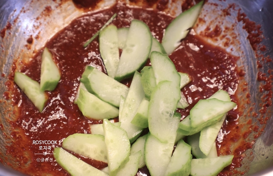 오이와 잘 어우러지는 맛이고 적당히 칼칼한 맛의 양념이 잘 어우러집니다.