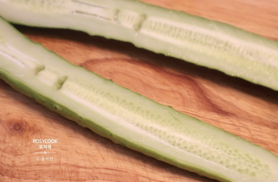 1. 오이를 소금으로 박박 문질러준 후, 세척해 주고 반으로 길게 갈라줍니다.