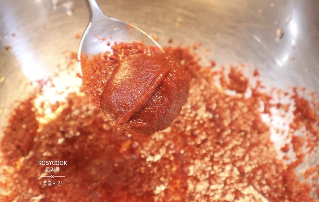 8. 식초 2 큰 술, 고춧가루 2 큰 술, 고추장 1/2 큰 술을 넣어준 후, 잘 섞어줍니다.