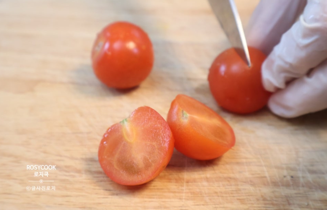 6. 방울토마토의 꼭지를 제거한 후, 반으로 썰어줍니다.