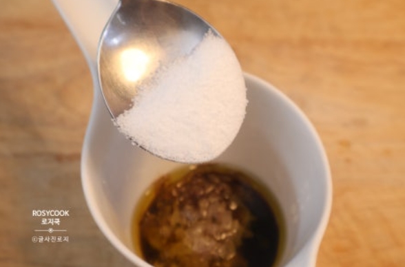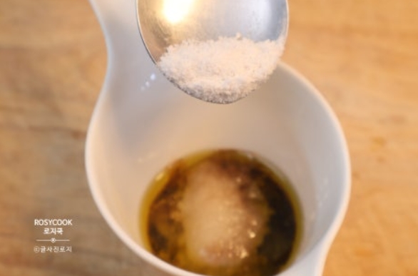 4. 스테비아 1/2 큰 술과 소금 1/3 큰 술을 넣어줍니다. 설탕 대신 스테비아를 사용했습니다.