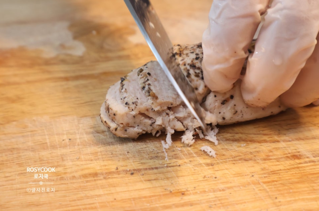 7. 훈제 닭가슴살을 전자레인지에 2분 정도 돌린 후, 적당한 두께로 썰어줍니다.