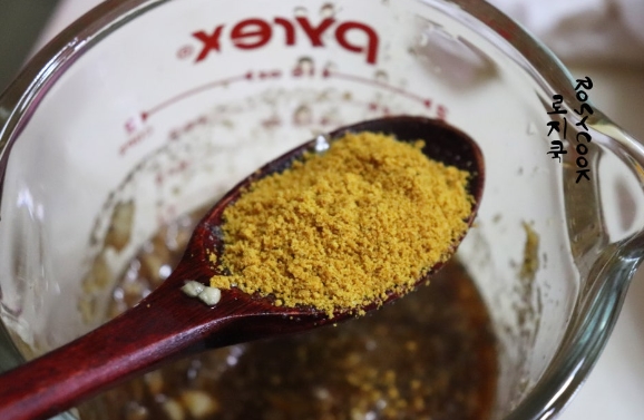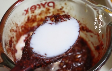 7. 고추장, 고춧가루, 우유를 넣어줍니다. 양념을 잘 섞어줍니다. 양념은 다 사용하지 않았습니다. 볶음밥을 볶을 때 양념 소스로 사용해도 좋습니다.