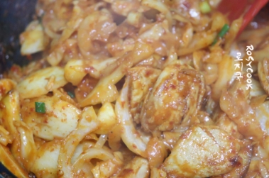 16. 떡과 양파도 넣고 함께 볶아줬습니다. 채소들이 숨이 죽으면서 양념이 잘 배고 고구마와 고기가 잘 익으면 대파를 뿌려서 마무리 해줍니다.