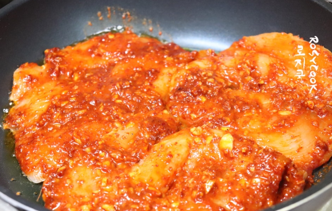 12. 먼저 미리 양념을 발라둔 닭가슴살을 구워줍니다.