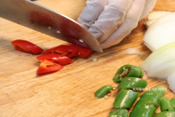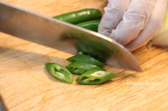 8. 청양고추 3개를 어슷썰기 하고, 홍고추 1개를 어슷썰기 해줍니다.