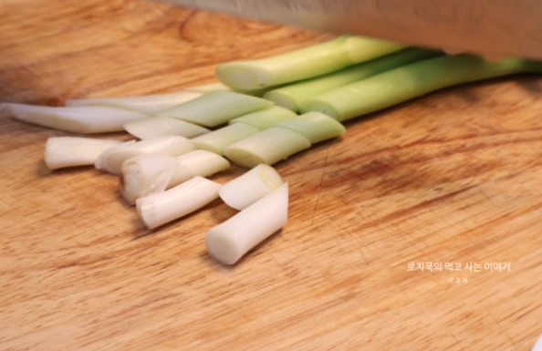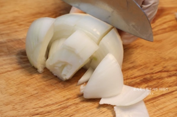7. 대파 3대를 큼직큼직하게 썰어주시고, 양파 200g을 깍둑썰기해줍니다.
