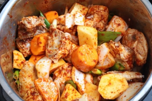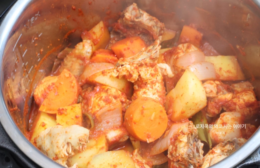 이렇게 재료를 한 번에 넣고 양념을 부어서 전기 압력솥에 조리하시면 됩니다. 매콤한 닭볶음탕 좋아하신다면 닭볶음탕 맛있게 만드는법 참고해서 만들어서 드셔보시길 바랍니다.