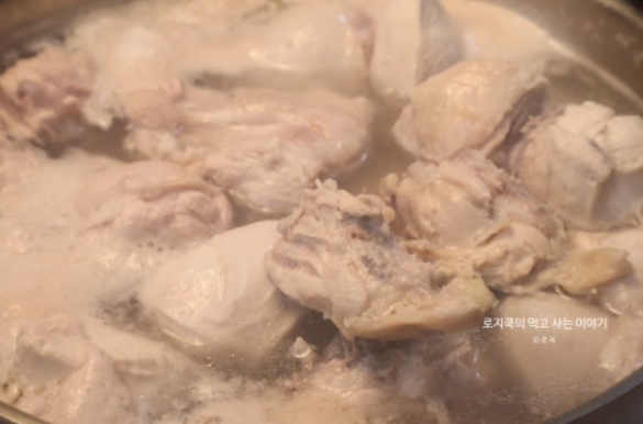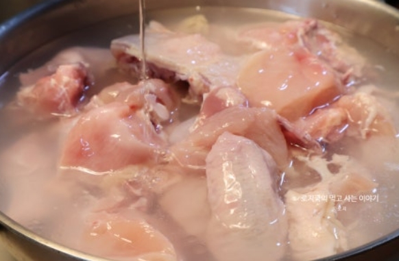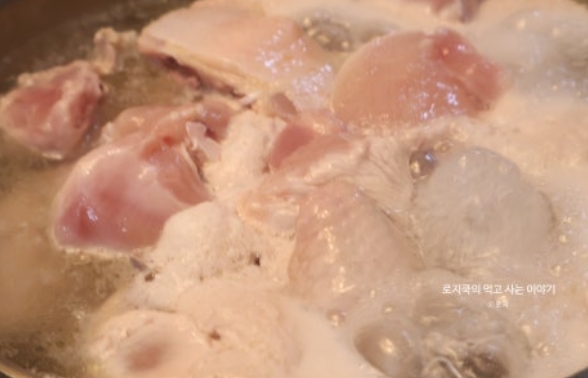 2. 끓는 물에 세척한 닭을 넣고 청주를 적당히 붓고(맛술이나 소주를 사용 가능) 다시 끓어오를 때까지 끓여줍니다.