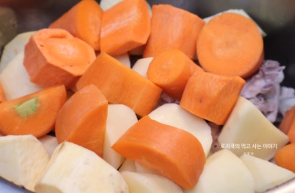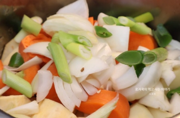 10. 손질해둔 감자, 당근, 양파, 파를 넣어줍니다.