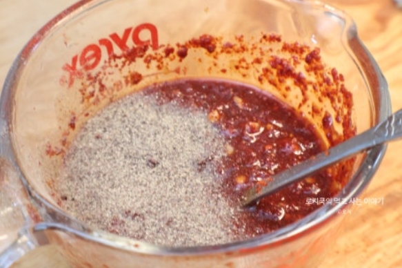13. 생강가루 1/4 티스푼, 설탕 1.5 큰 술, 고춧가루 5 큰 술을 넣고 잘 섞어줍니다.
