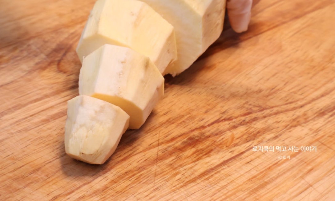 6. 껍질을 깐 고구마 294g도 먹기 좋은 크기로 썰어줍니다. 고구마도 넣어봤는데 고구마가 싫으신 분들은 감자를 추가로 사용하시면 됩니다.