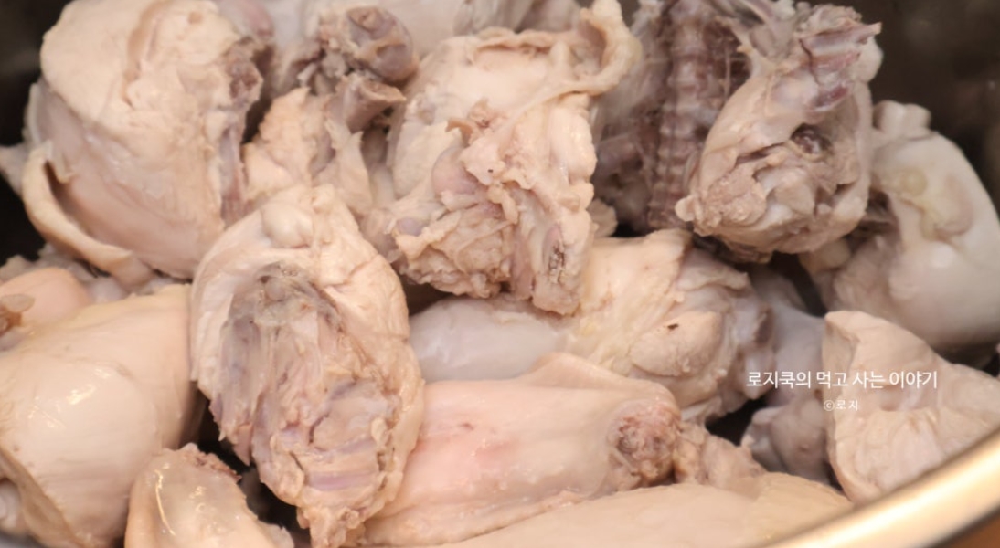 9. 전기 압력솥에 데쳐둔 닭을 넣어줍니다.