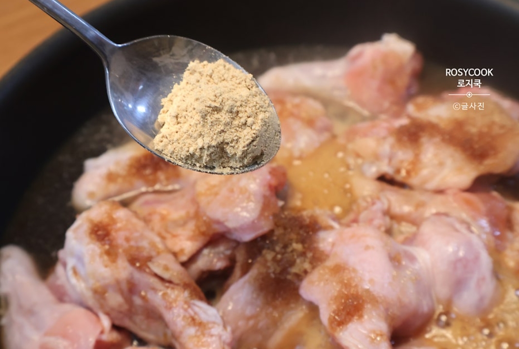 6. 간 생강을 넣어줍니다. 통생강을 쓰실 분들은 얇게 썰어서 올려주시면 됩니다. 저는 간 생강이 없어서 생강 가루 1/2 큰 술을 넣었습니다.
