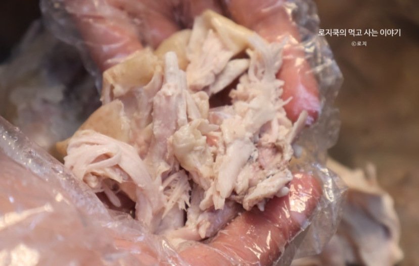 16. 식힌 삶은 닭에서 살을 발려 잘게 찢어서 준비해 줍니다.