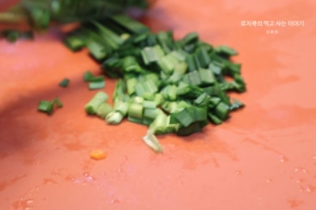 15. 기둥을 제거한 표고버섯을 다져주고, 부추도 소량 잘게 다져서 준비해 줍니다.