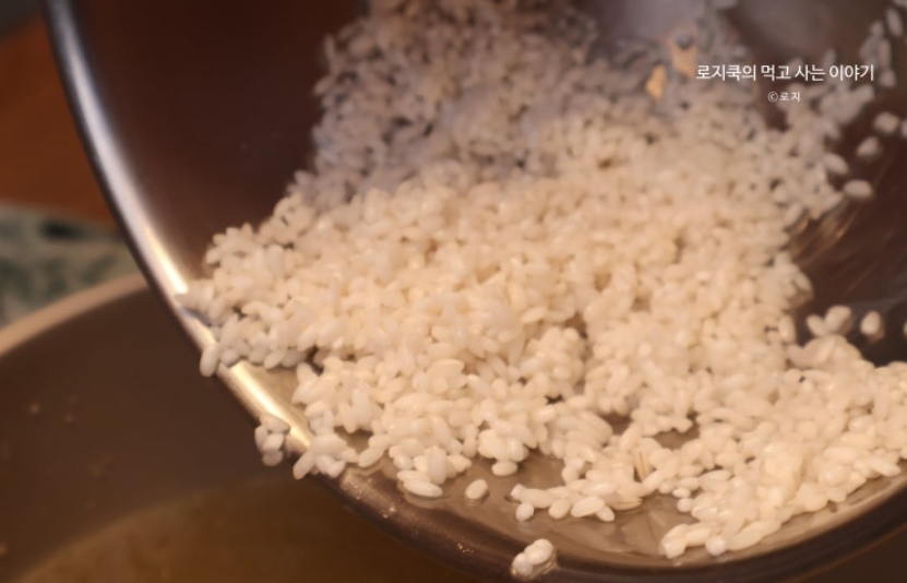 20. 찹쌀이 퍼지기 시작했다면 양파와 당근을 넣어줍니다.