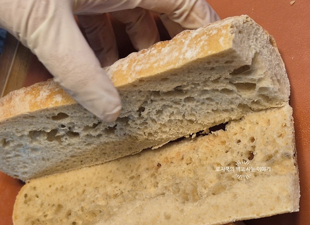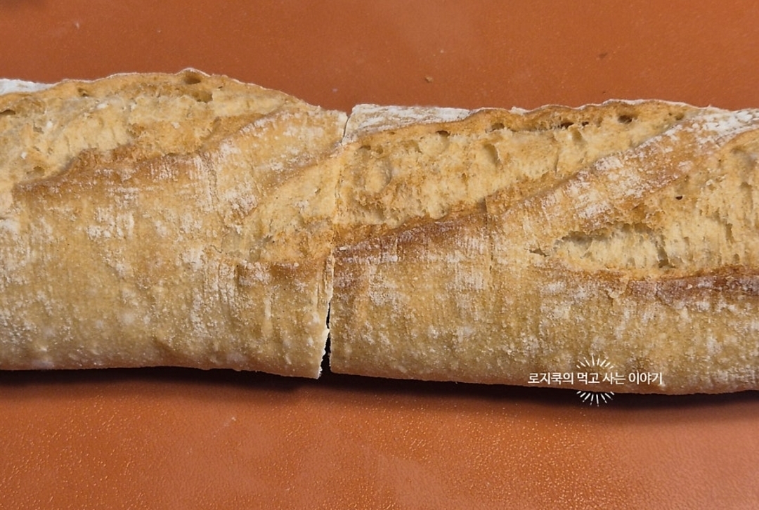 8. 바게트를 반으로 썰어준 후, 갈라줍니다. 빵은 원하는 걸로 아무거나 선택하시면 됩니다.