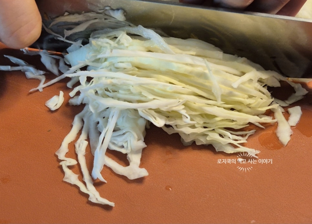2. 양배추도 채 썰어줍니다. 403g 사용했습니다.