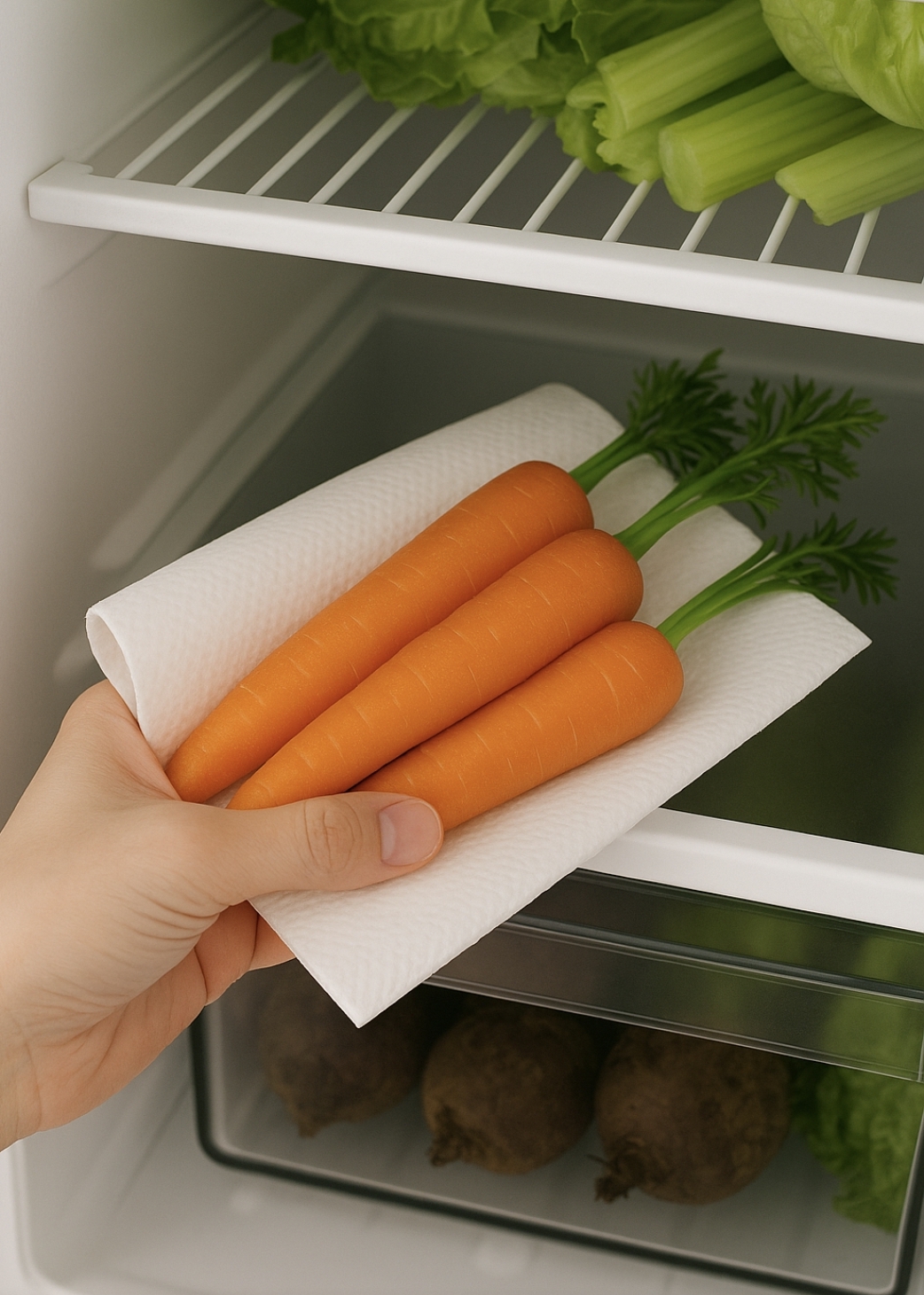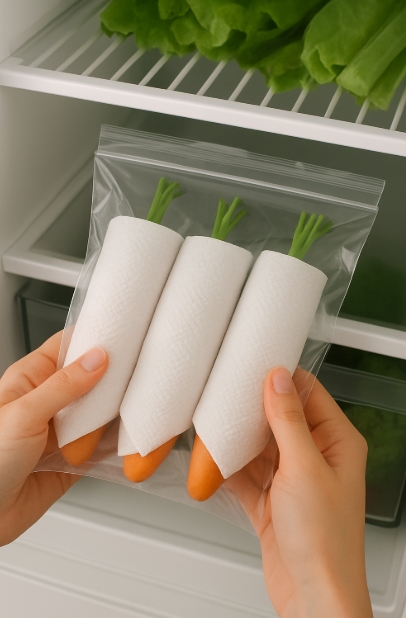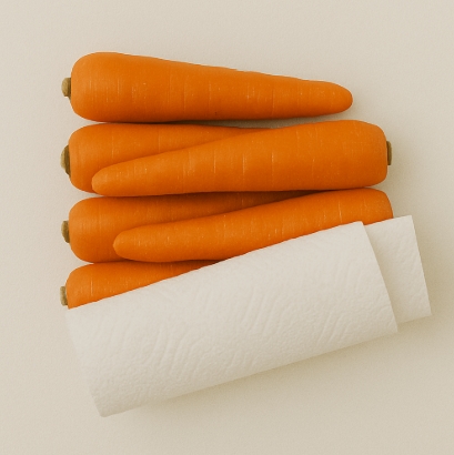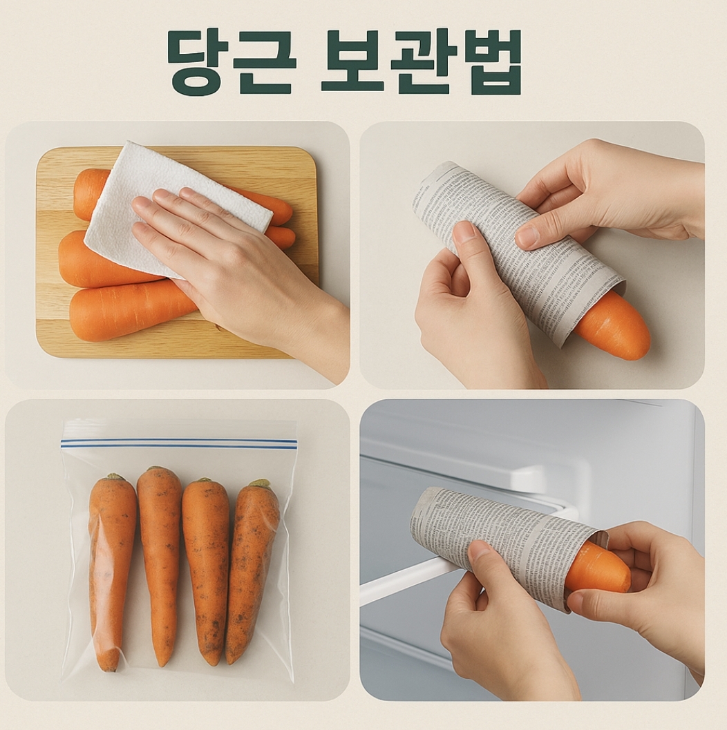 깨끗이 닦은 당근을 신문지나 키친타월로 하나하나 감싼 뒤, 비닐팩에 넣어 밀봉하고 채소 칸에 보관하는 방법이죠.