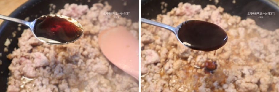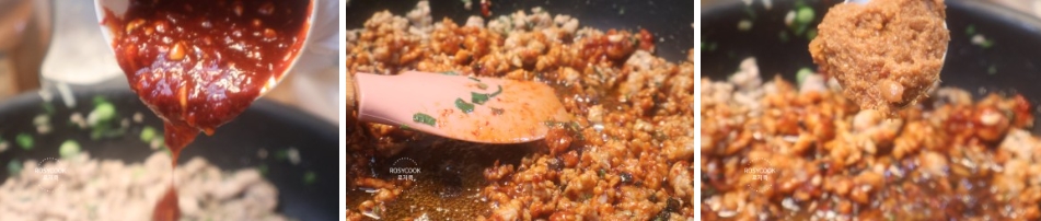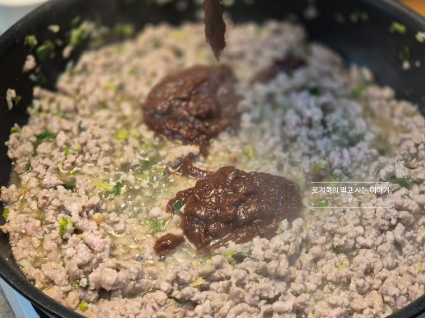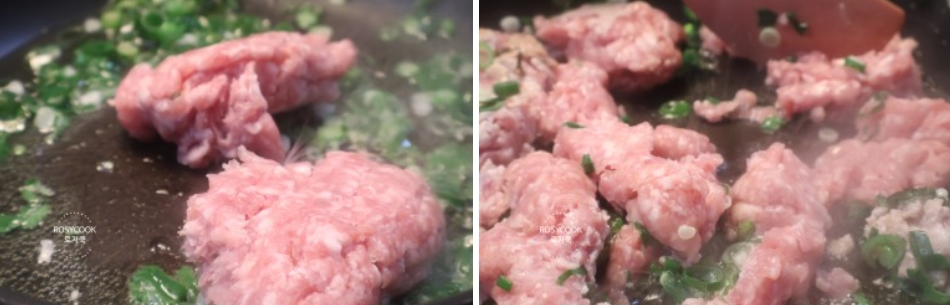 6. 파가 익기 시작하면, 간 돼지고기를 넣고 풀어가면서 볶아줍니다.