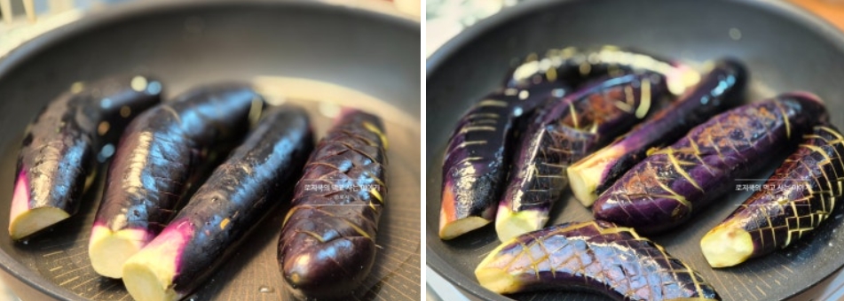 5. 팬에 식용유를 넉넉하게 두른 후, 예열해 주고 가지가 벌어지면서 겉이 노릇노릇하게 익을 때까지 구워줍니다.